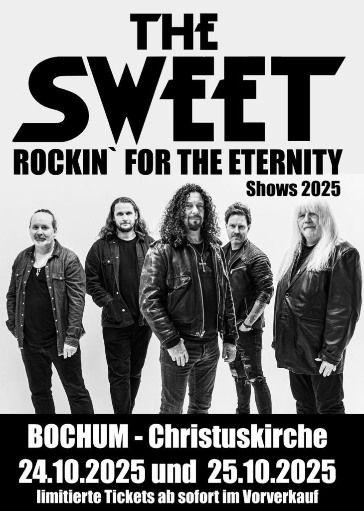 Am 24.10.2025 und 25.10.2025 gastieren The Sweet in der Bochumer Christuskirche. Mit im Gepäck hat die legendäre britische Rock-Formation neben neuen Stücken auch Hits wie The Ballroom Blitz, Teenage Rampage, Blockbuster! oder Fox on the Run.